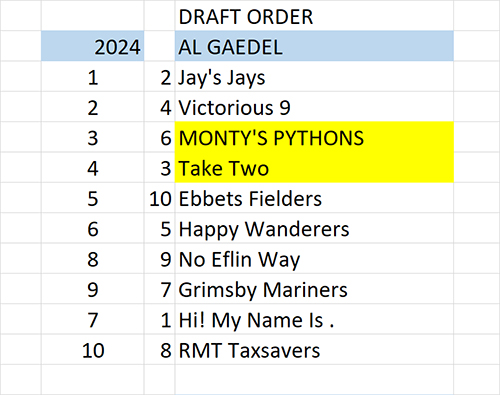 Draft order is determined by finish placement the previous year. Last place team picks first, etc… The two teams in the final playoff series make up the last two draft slots, with the series winner picking last.