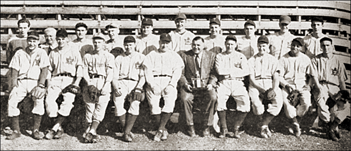 Back (L-R) - Dave Mustard 2B, Johnny Dow Trainer, Art Upper OF, Vic Goeberis OF, Hugh Cuddie OF, Murray Exeard P, Shog Park 1B, Ross Woodrow 1B, George McLagen C, Archie Chapman P