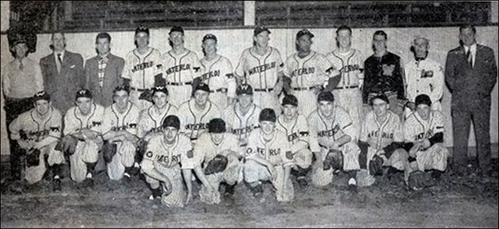 Back (L-R) - Oscar Voigt (Bus Driver), Carl Heinrich (Secretary), Francis "Red" Kane 1B, Alex Kvasnak CF/MGR, Marv Myers P, Augie Herchenratter RF, John Fornari C, Manny McIntyre SS, Arno Eichholz 1B, Unknown (Asst Trainer), Fred McAvoy (Trainer), Ernie Goman (President).