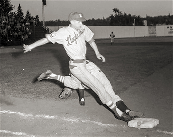 An unidentified (Dick Barry?) Lloydminster Meridan on a close play at first base at Renfrew Park at Edmonton.