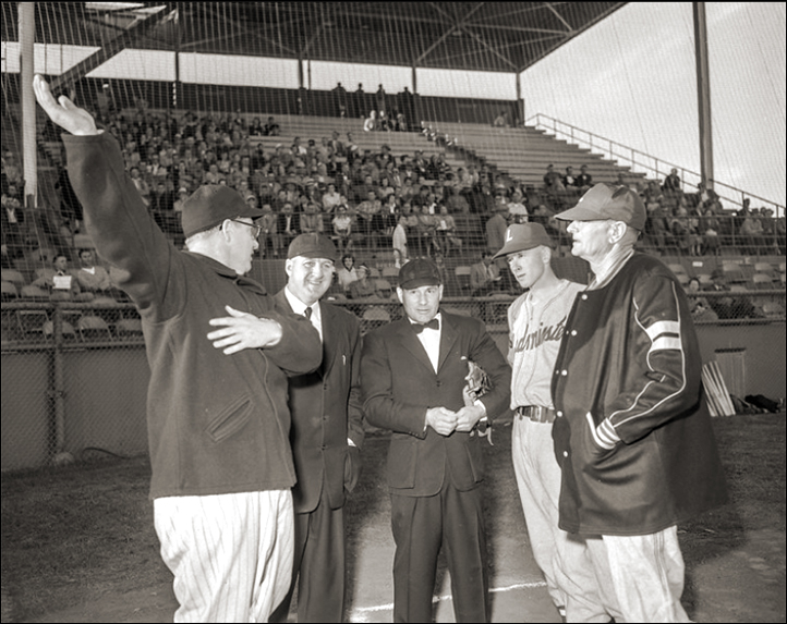 The season opener, June 10th, at Renfrew Park at Edmonton. The pre-game conference with with Edmonto manager Roy Carlson, umpires Jim Kelly and John Lupul, and Lloydminster's Don Stewart and Ted Mitchell.