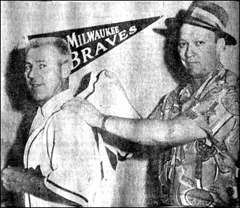 Left - Regina owner Denny Evenson (right) helps Pete Beiden with his new jersey as manager of the Regina Braves. Beiden, no stranger to the WCBL, takes over from Suge Carter.