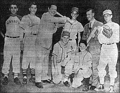 Left - Pony and Little Leaguers in Detroit, Michigan for the Global World Series. The youths were selected to represent the teams in the Western Canada Baseball League. Left to right - Wally Anderson (Saskatoon), Ron Rowley (North Battleford), Joe E. Brown. famed comedian and president of the U.S. Pony League, Glenn Bosch (Regina), Barry Shankoff (Moose Jaw), David Olson (Edmonton), Lew Hayes (U.S. Pony League Commissioner), and Lawrence Mock (Lloydminster).