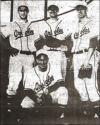 Below left - Kelowna's hard-hitting quartet. The Orioles, the defending champions, rapped seven home runs in a double-header with Bob Campbell (kneeling) leading the way with three circuit clouts. Standing (left to right), Frank Fritz, Bob Radies and centre fielder Bill Martino, who had a pair of four baggers.