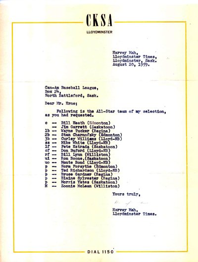 c Bill Heath, Williston; Jim Garrett, Saskatoon; 1b Wayne Tucker, Regina; 2b Stan Charnofsky, Edmonton; 3b Curly Williams, Lloyd-NB; ss Zoonie McLean, Williston; u Cliff Pemberton, Regina; of Pete Estrada, Saskatoon; Bill Lynn, Williston; Tom Satriano, Edmonton; p Norm Forsythe, Edmonton; Gene Graves, Saskatoon; Ted Richardson, Lloyd-NB; Alton Arnold, Lloyd-NB; Bruce Gardner, Regina.