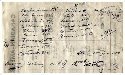 The Lloydminster payroll is worked out on the back of a        schedule. It's not known, but assumed, that the handwriting is that of  Slim Thorpe the team's president. (Click        image for a larger version.)
