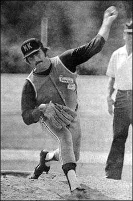 (Photo - Jim Bouton, with cap flying, hurls a two-hit shutout against Barrhead. Calgary Herald, July 21, 1975)