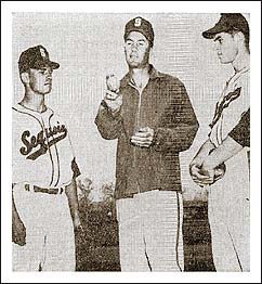 Above right - Another pair of Roy's boys. Len Tucker (left) suited up at Sequoias and followed Roy to Kamsack in 1952. Jack Hannah (right) pitched for Roy at Saskatoon in 1951.